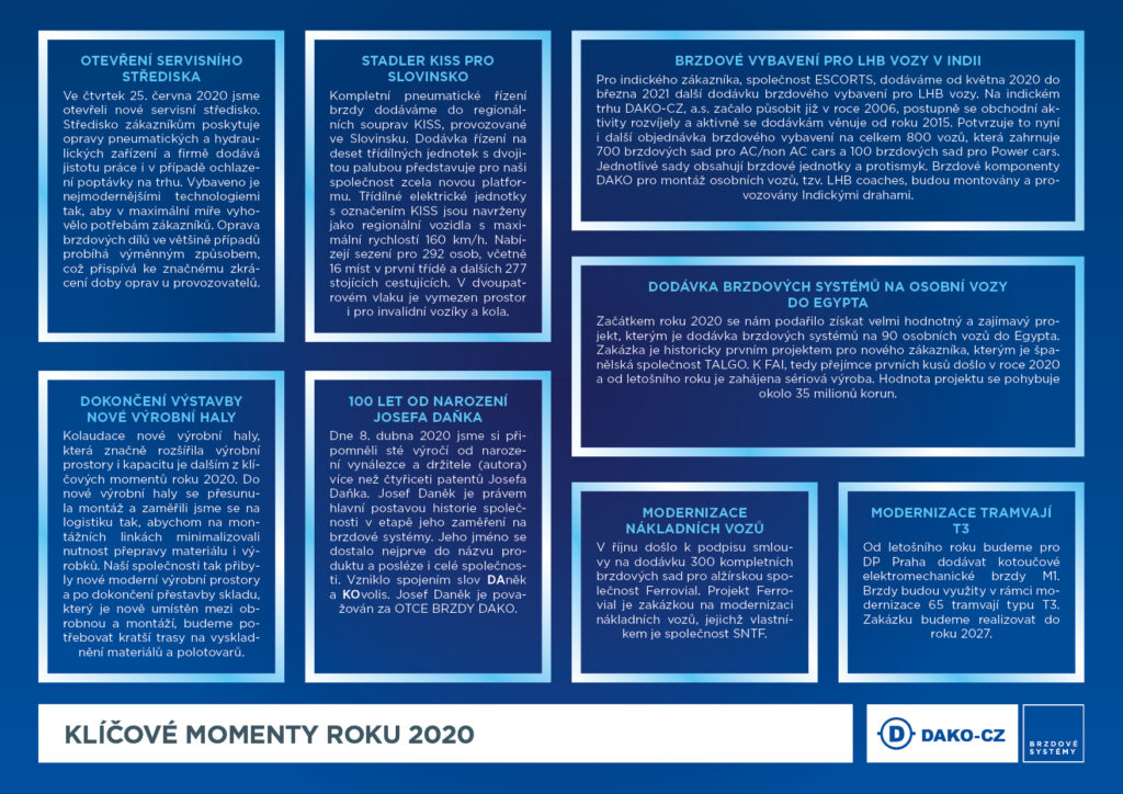 Začátkem roku 2020 se nám podařilo získat velmi hodnotný a zajímavý projekt, kterým je dodávka brzdových systémů na 90 osobních vozů do Egypta. Zakázka je historicky prvním projektem pro nového zákazníka, kterým je španělská společnost TALGO. K FAI, tedy přejímce prvních kusů došlo v roce 2020 a od letošního roku je zahájena sériová výroba. Hodnota projektu se pohybuje okolo 35 milionů korun.